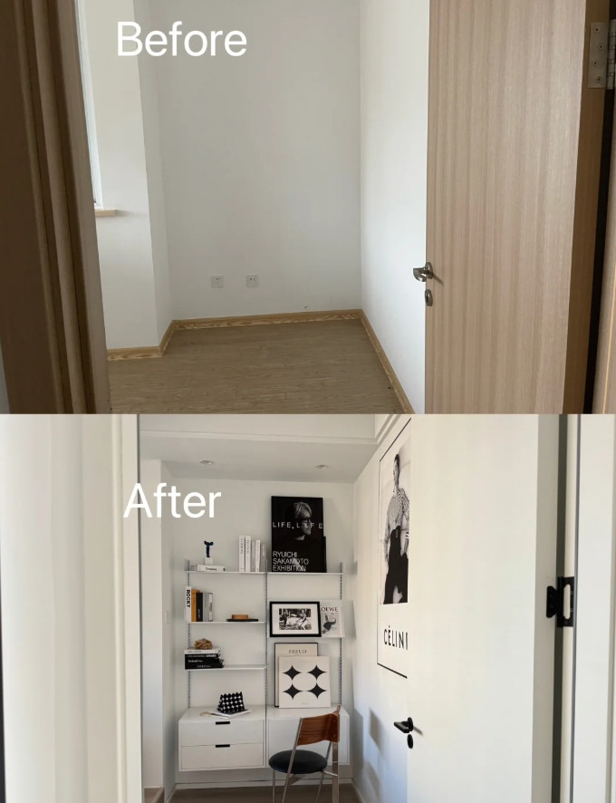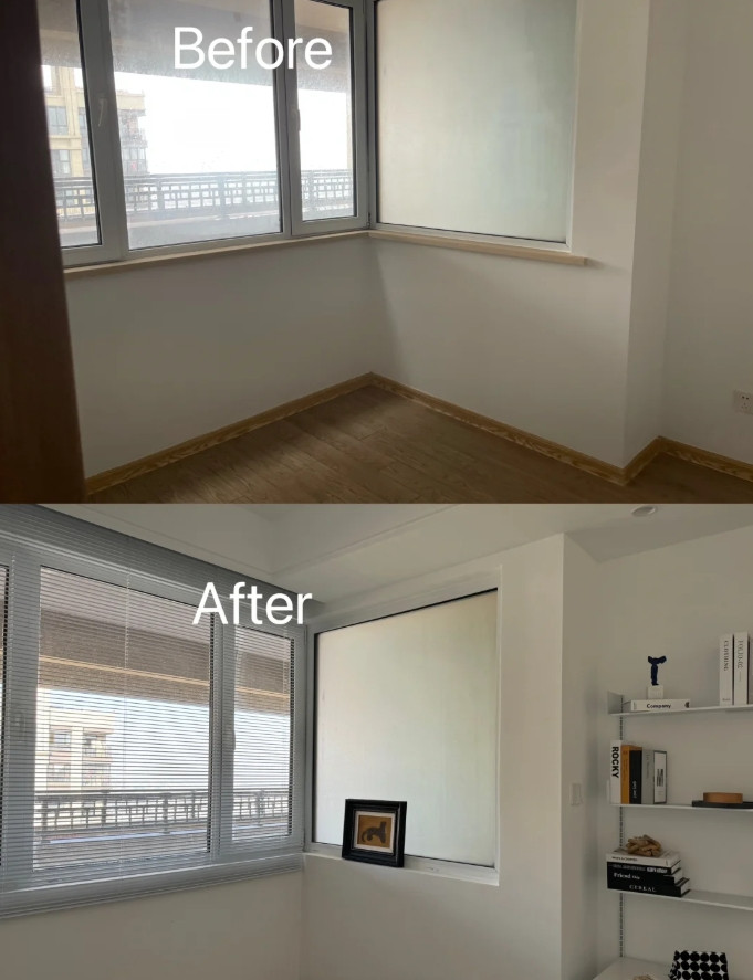 📚 书房是朝北的,有两面窗户,一面小的是磨砂的,所以没做窗帘,另一面大的窗户选择了百叶帘,半拉开的时候真的很显氛围,墙上打了一组书架,当一个摆件台还是挺不错的