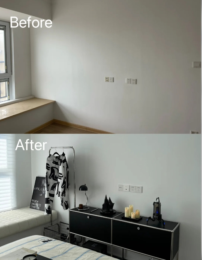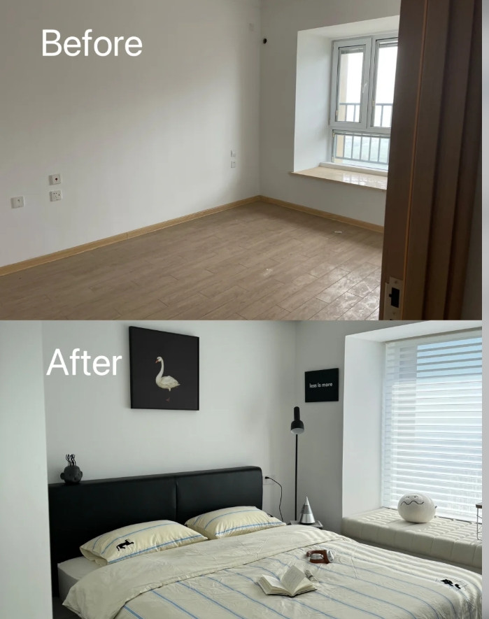 🛏️ 三个卧室其中有两个是朝南的,窗帘是香格里拉帘,木地板通铺,没有过门石没有压条,是真正意义上的全屋通铺的,硬装方面也是很简单,全部是大白墙,配个黑色的床,换个四件套就是一种风格,目前为止还是越看越爱,没有审美疲劳,所以装修尽可能的留白挺好的,方便后期软装的发挥