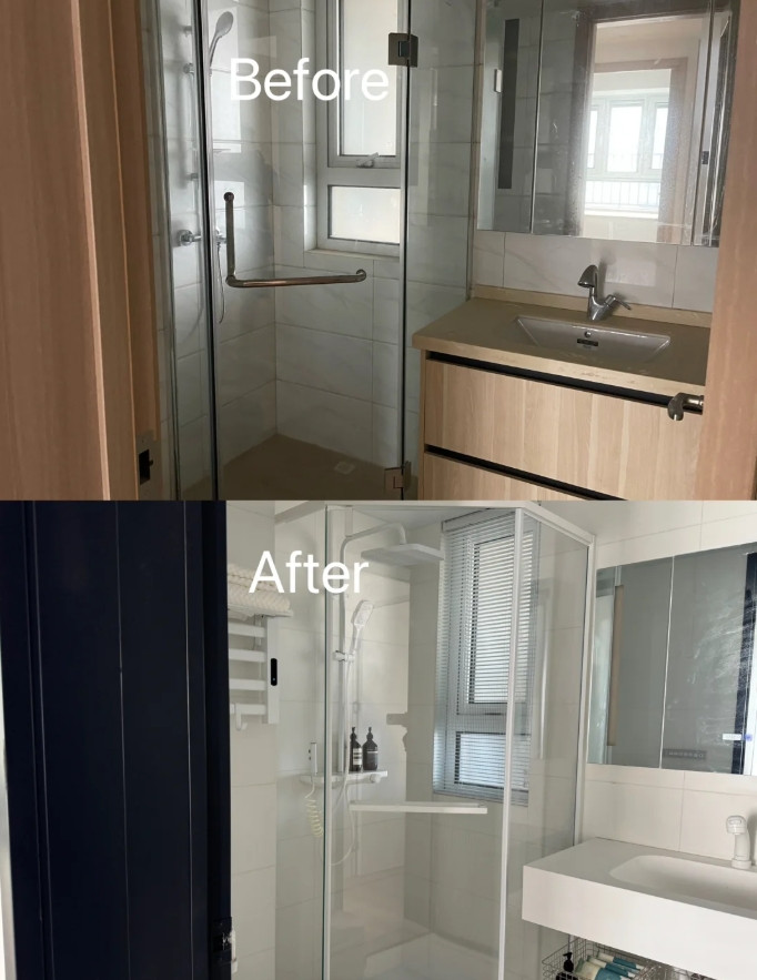 🍴🛁 一厨一卫的,全部是亚光砖通贴,白色肤感定制柜门➕柜体,厨房的台面包括洗手池水龙头也是白色,卫生间同理,只要是肉眼所见的全部是白色,真的很好看,就喜欢这种纯白色极简的